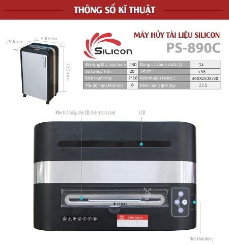- Máy hủy tài liệu Silicon PS-890C được thiết kế với kiểu dáng linh hoạt, mang tính thẩm mỹ cáo, có tính năng phù hợp với văn phòng quy mô vừa và nhỏ.