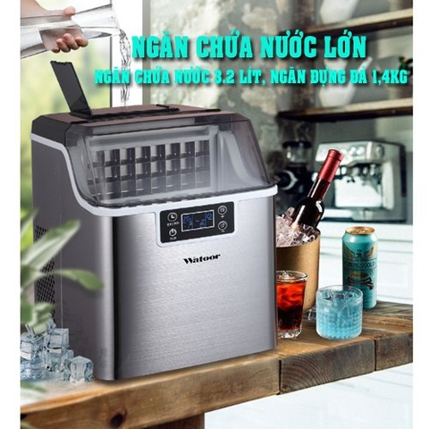 – Bình chứa nước lớn lên tới 3,2 lít với ngăn đựng đá 1,4kg. Một lần làm đá là 24 viên 1 mẻ đủ để cho một quán cafe phụ vụ lượng khách đông.