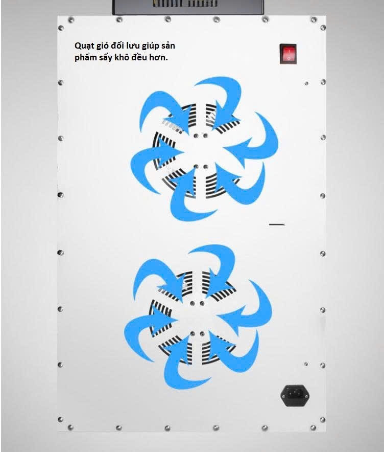 - Quạt thông gió của máy sấy thực phẩm 16 khay được đặt phía sau. Khi máy chạy quạt sẽ thổi không khí nóng vào bên trong buồng sấy. Không khí này chạy sắp buồng sấy và mang hơi nước thoát ra từ thực phẩm. Vì vậy, thực phẩm sấy khô sẽ đạt chất lượng đồng đều trong một mẻ sấy.